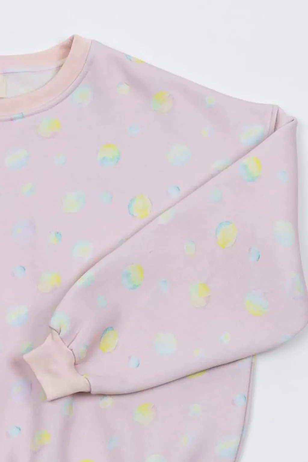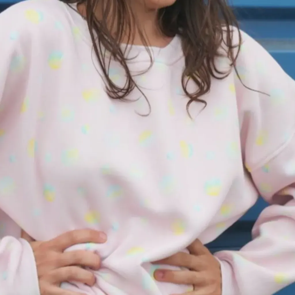 Coupe oversize légèrement crop, avec emmanchure basse pour un look rétro-contemporain. Le motif Bulle rose est entièrement dessiné à la main par la créatrice de Ayuna.