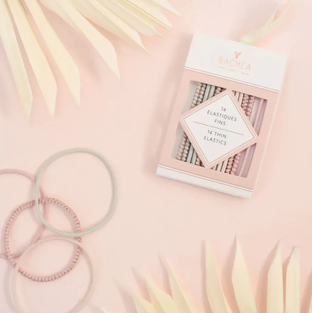 Déclinés dans les tons pastels et ornés d’un fil lurex cuivré, les élastiques Bachca peuvent être utilisés en toutes circonstances.