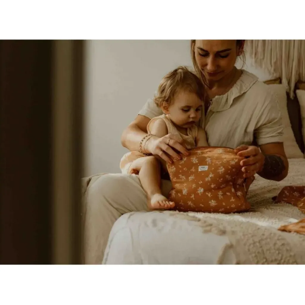 - Matières : Gaze de coton biologique (extérieur) et polyester recyclé (rembourrage)
