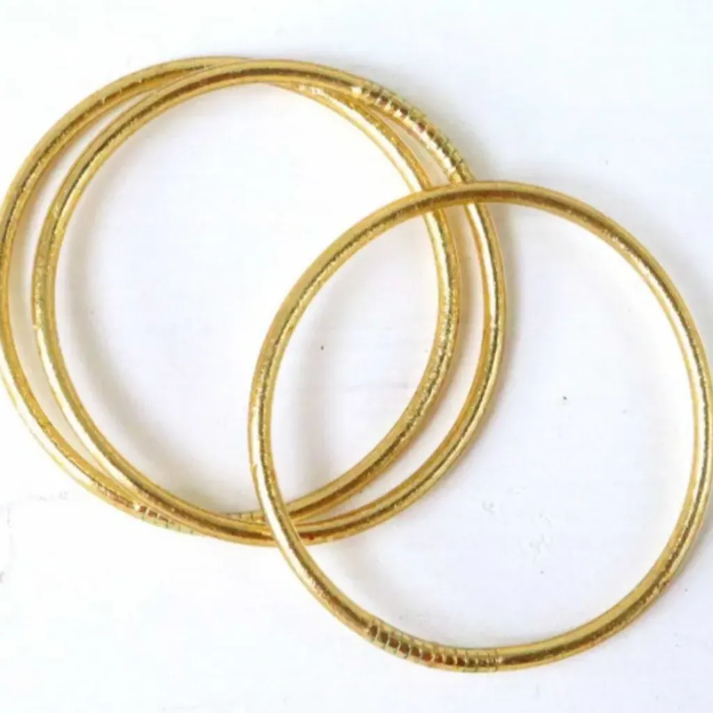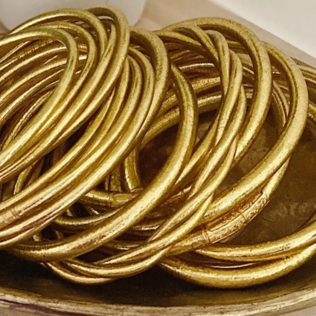 - Un bracelet bouddhiste constitué d’un jonc souple et transparent rempli à la feuille d’or ou d’argent