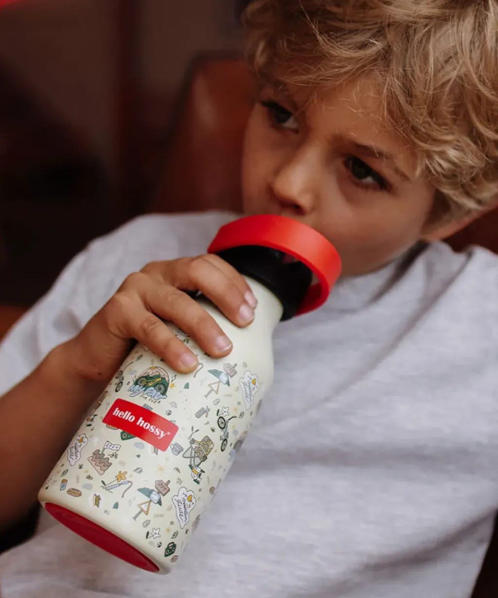 Optez pour la Gourde Isotherme pour enfants, Mountain Ride, de Hello Hossy. Tous les détails ont été réfléchis pour les kids : 350ml, anse de transport, paille (ou pas), base anti-dérapante.
