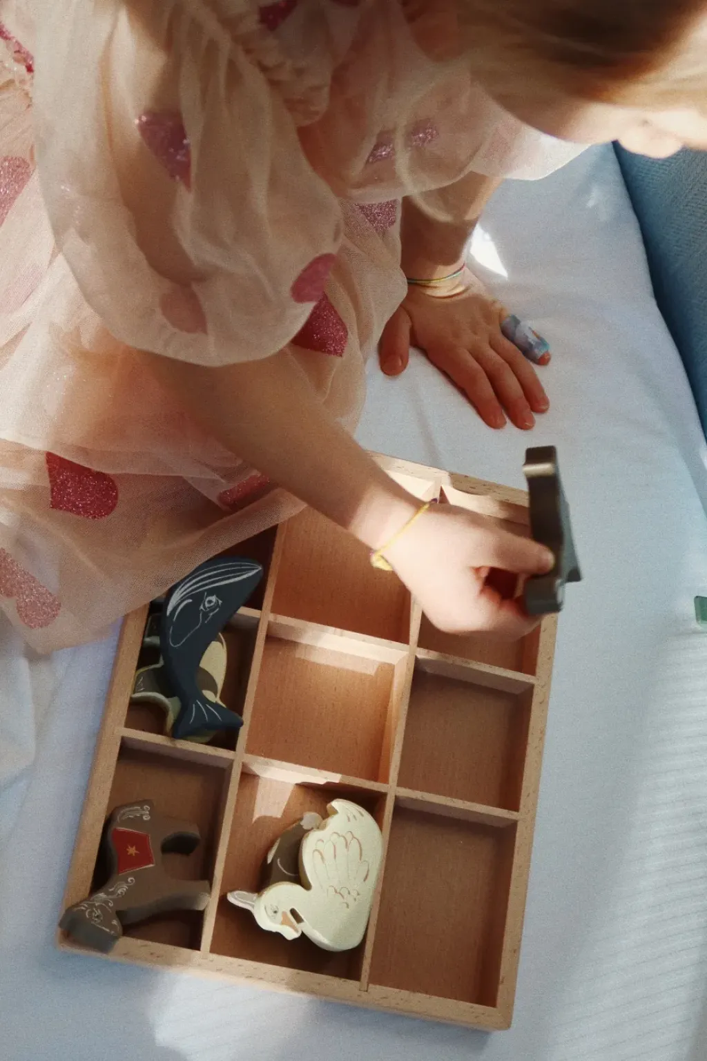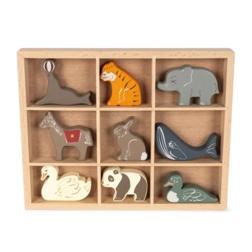 Boîte en bois de hêtre aussi adorable que pratique présentant 9 animaux différents.