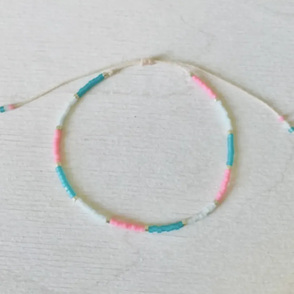 Joli bracelet fin et réglable en perles Miyuki doré vert d’eau et rose. On craque pour les créations de cette jeune créatrice française.