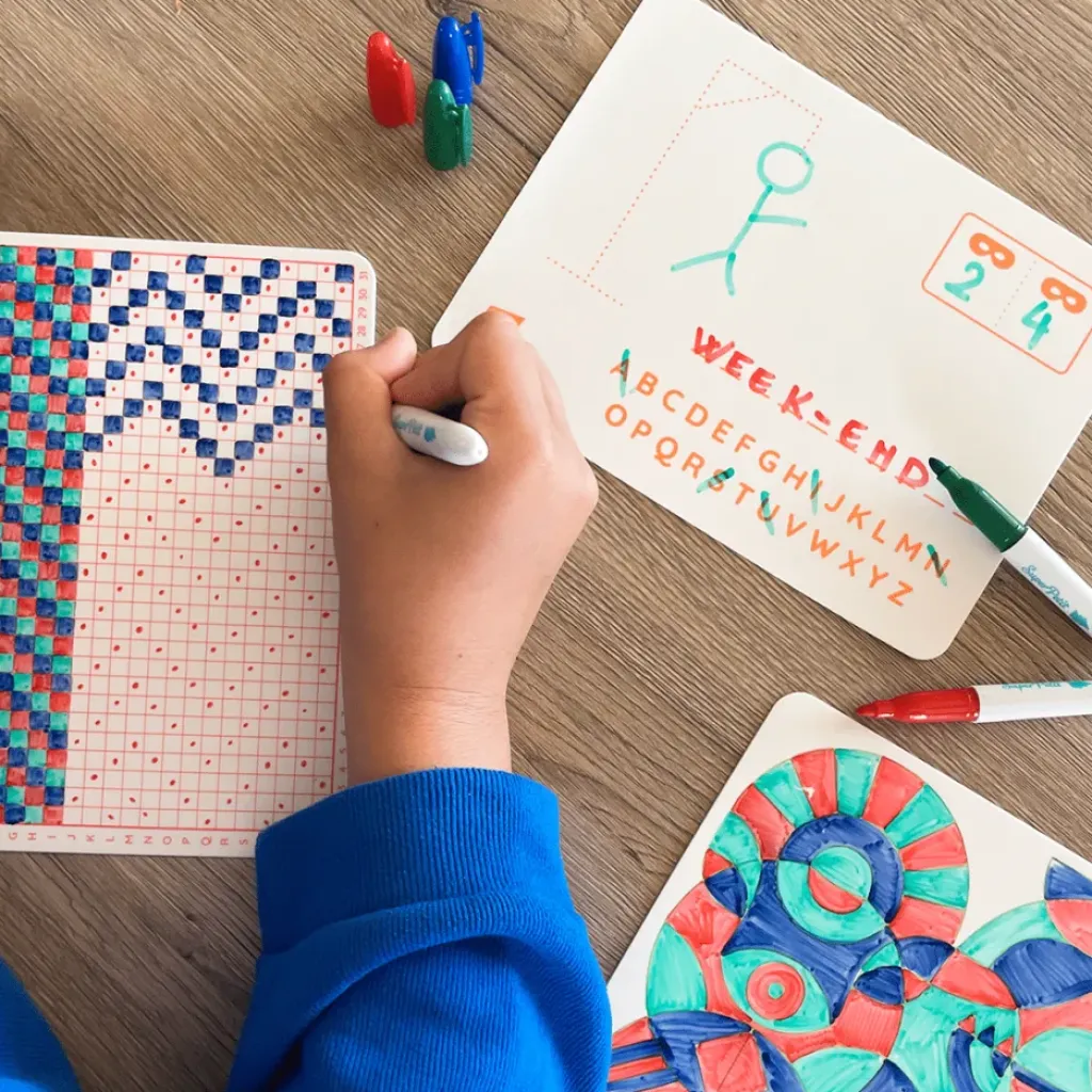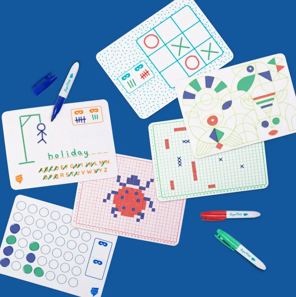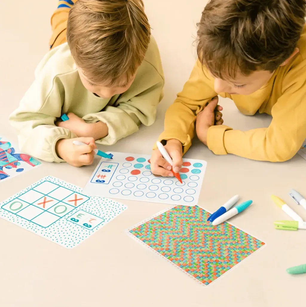 Redécouvrez ces classiques de l’enfance en version silicone réutilisable à l’infini : morpion, pendu, bataille navale, 4 en ligne, mandala et pixel art.