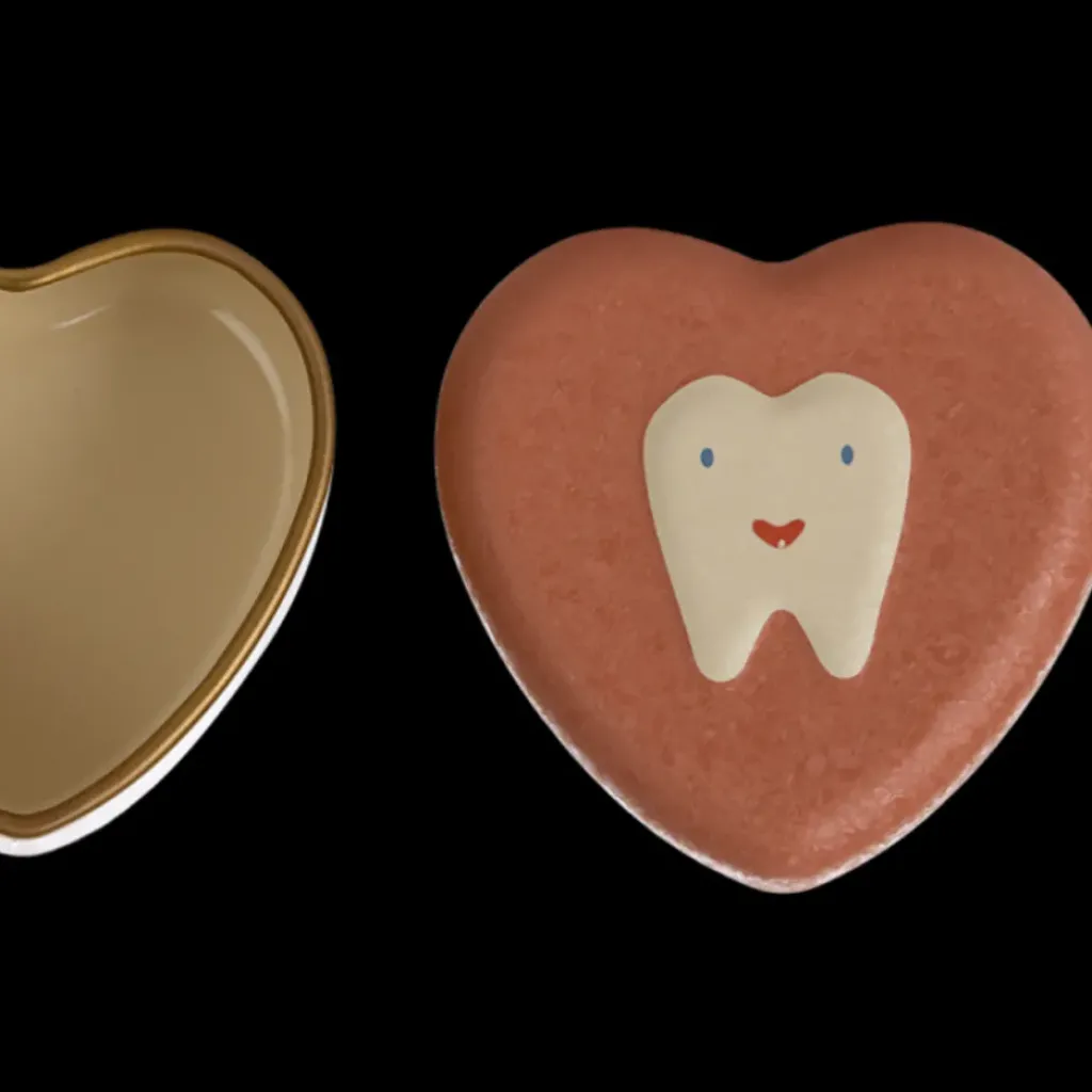 Cette boîte en métal et en forme de cœur est l’endroit idéal pour conserver les dents de lait et conserver des souvenirs d’enfance. La boîte est ornée d’une jolie dent en relief et d’une surface à l’allure craquelée, sur le couvercle.
