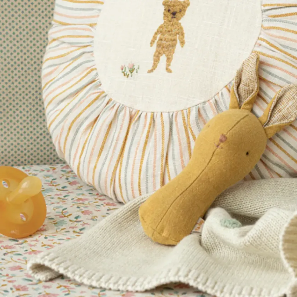 Ce hochet s’adapte parfaitement à une petite main et émet un son stimulant. Il est fabriqué dans des tissus doux aux imprimés uniques et, emballé dans une boîte cadeau.
