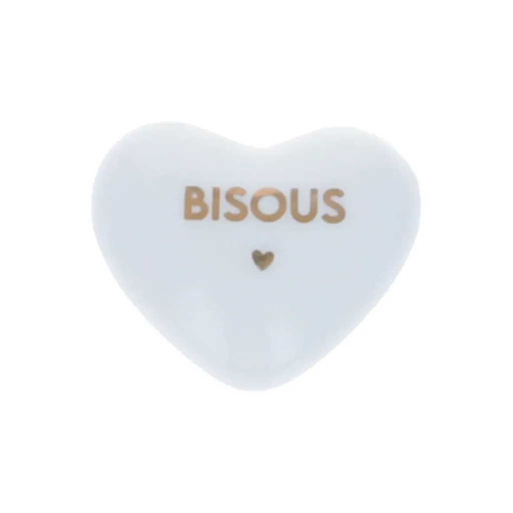 Un petit cœur en porcelaine décoré d’un petit mot « Bisous » à l’inscription dorée ! Une petite attention délicate à offrir à ses proches, pour communiquer son amour et porter chance… ou à s’offrir en porte bonheur !