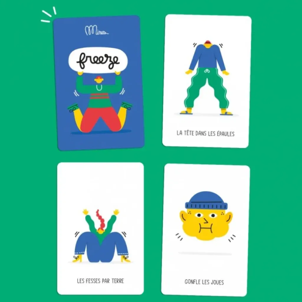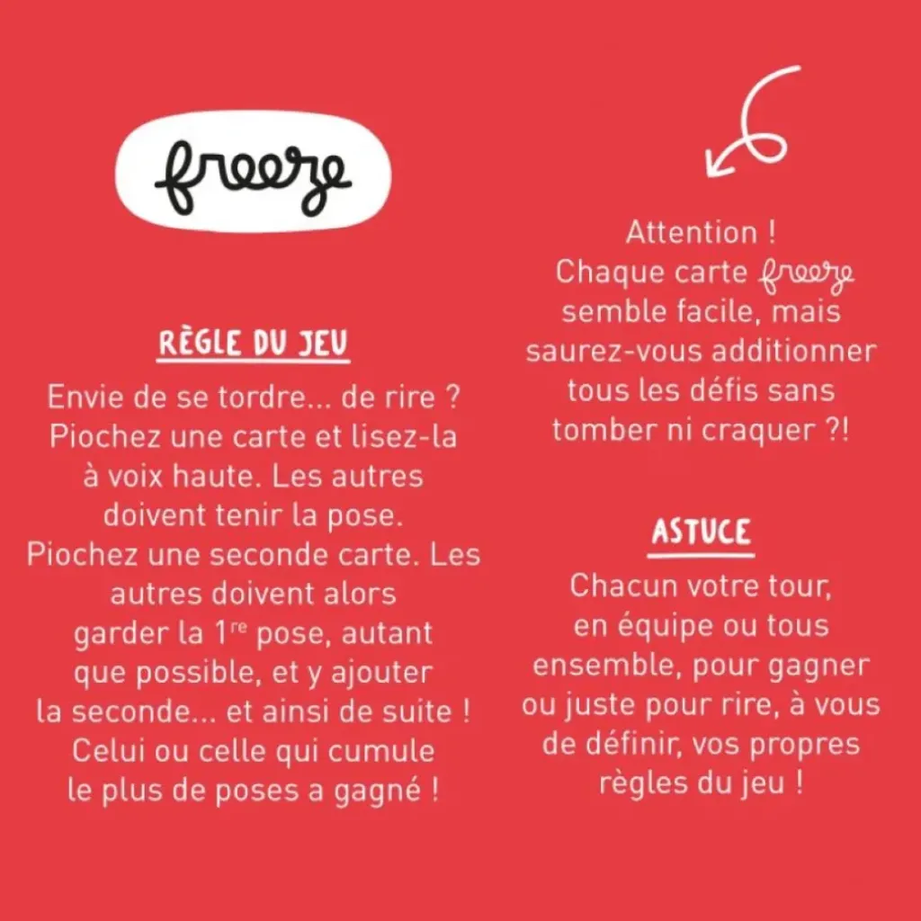 → 50 cartes freeze : Un bras derrière la tête, une jambe en l’air, une main au sol… Ils vont cumuler des poses et se contorsionner. Attention à ne pas craquer en premier !