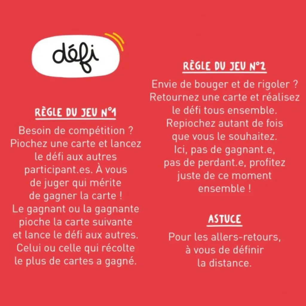 → 50 cartes défi : Ramper sans s’aider de ses pieds, avancer en regardant entre ses jambes, écrire son prénom avec ses fesses… Lancez-leur des défis amusants et tout en mouvement !
