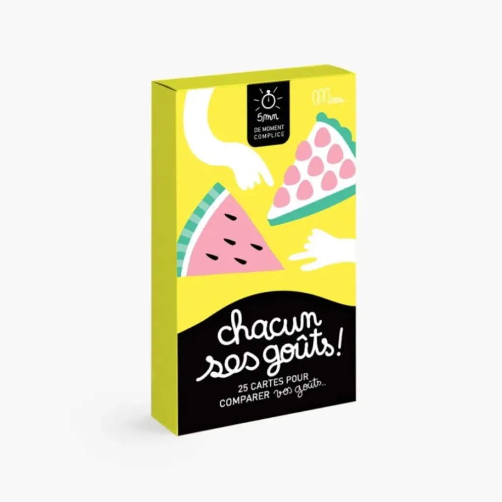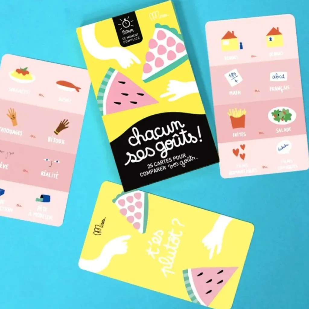 » T’es plutôt bain ou douche ? « . Les goûts et les couleurs, ça ne se discute pas ! Ah bon ?! Voici 25 cartes pour comparer vos goûts, découvrir vos points communs et vous étonner de vos différences. Que vous soyez en famille ou entre amis, une seule certitude : vous passerez au moins 5 min d’un bon moment drôle et complice !