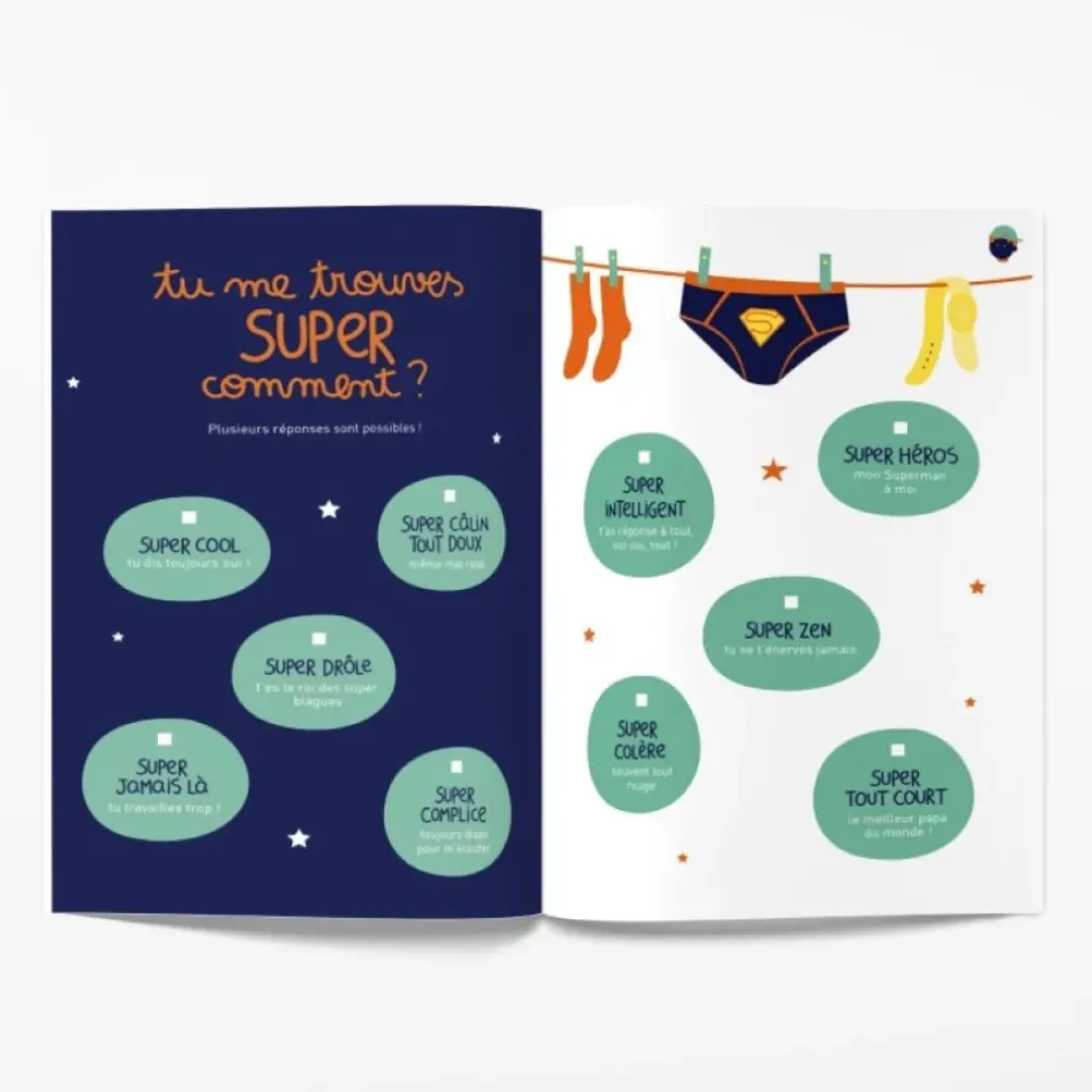 Entre père et fils, vous vous adorez, vous vous faites la tête, puis vous vous faites un check ! Avec un brin d’humour, beaucoup de sensibilité et de de légèreté, ce livre à compléter vous propose d’explorer ce qui vous lie, vos ressemblances ou ce qui vous oppose. Au programme : 60 pages de questions, de jeux et d’activités ludiques pensés pour de vrais moments complices entre garçons ! Un cadeau original pour un futur papa ou un papa déjà bien expérimenté à l’occasion de la fête des pères.