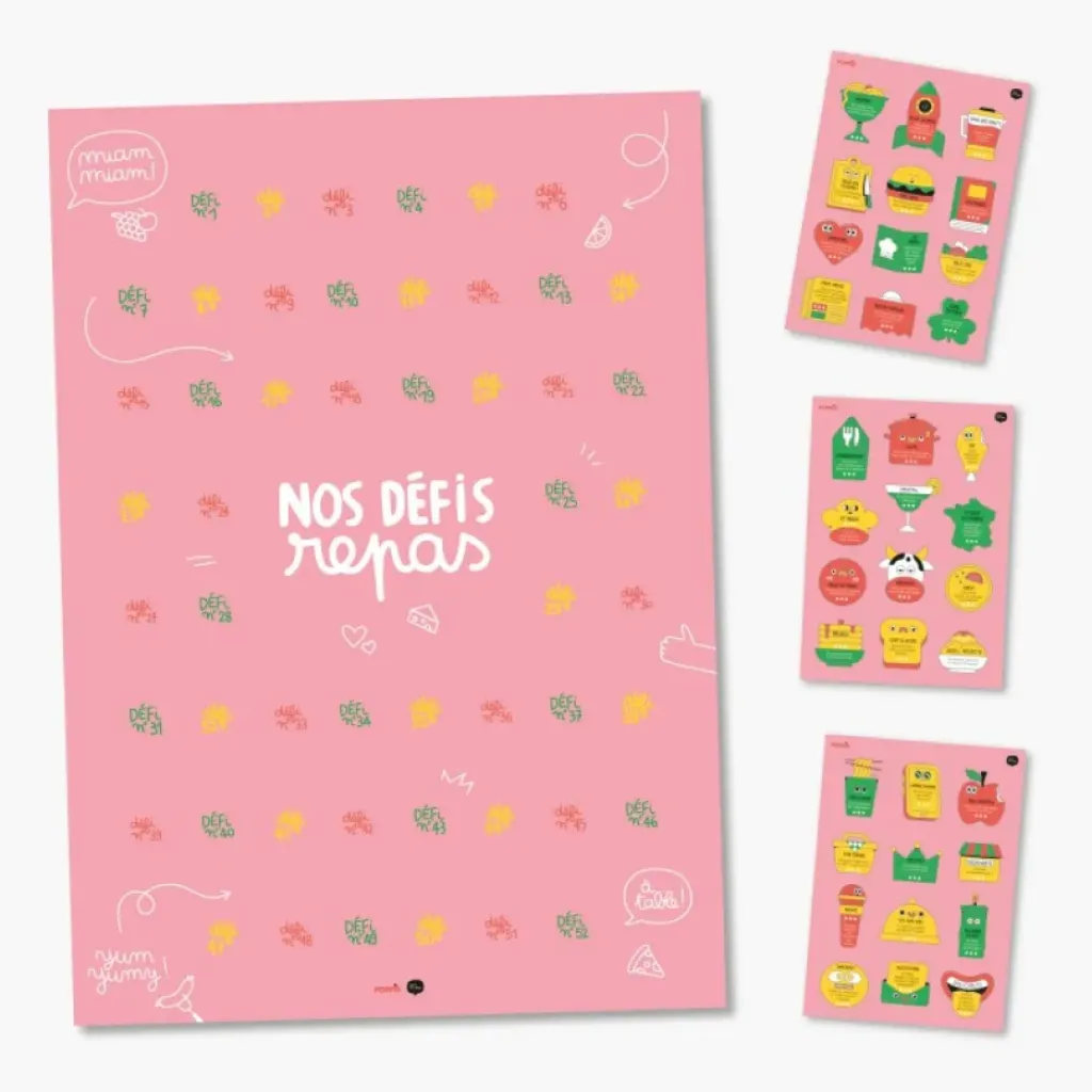 Choisissez ensemble 52 stickers défis parmi tous ceux proposés : un repas tout vert à imaginer ? Un dîner à la bougie ? Un défi pour manger avec les doigts… il y en a pour tous les goûts !