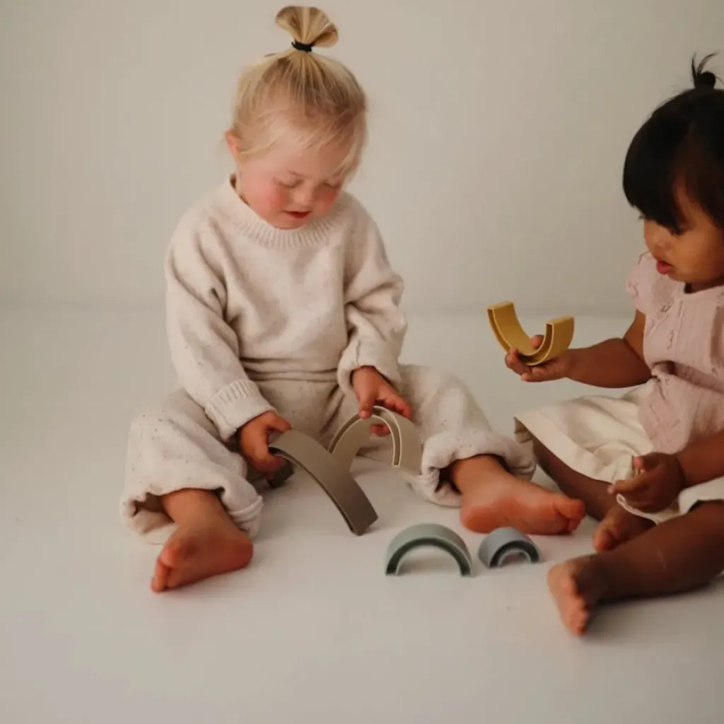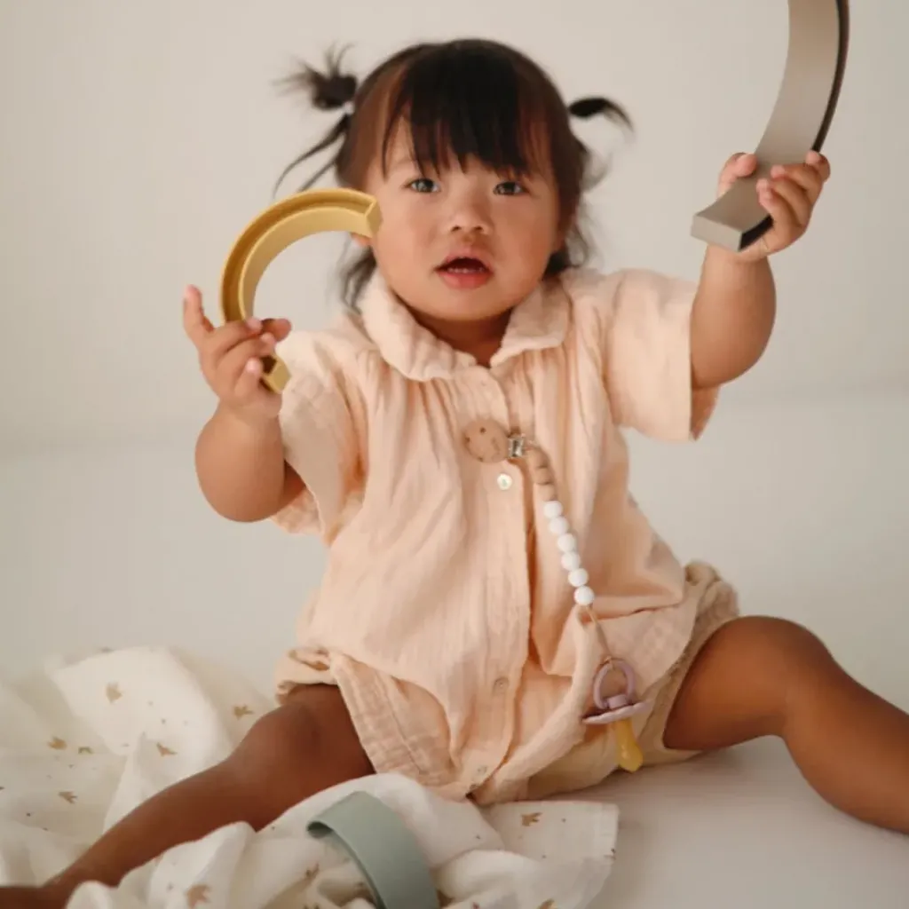 Arc-en-ciel à empiler Mushie. Fabriqué en plastique 100% non toxique, ce jouet au design Danois, est attrayant par ses couleurs et sa forme d’arc en ciel. Sa taille est adaptée aux petites mains.
