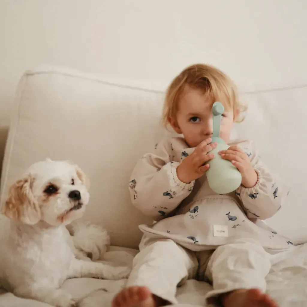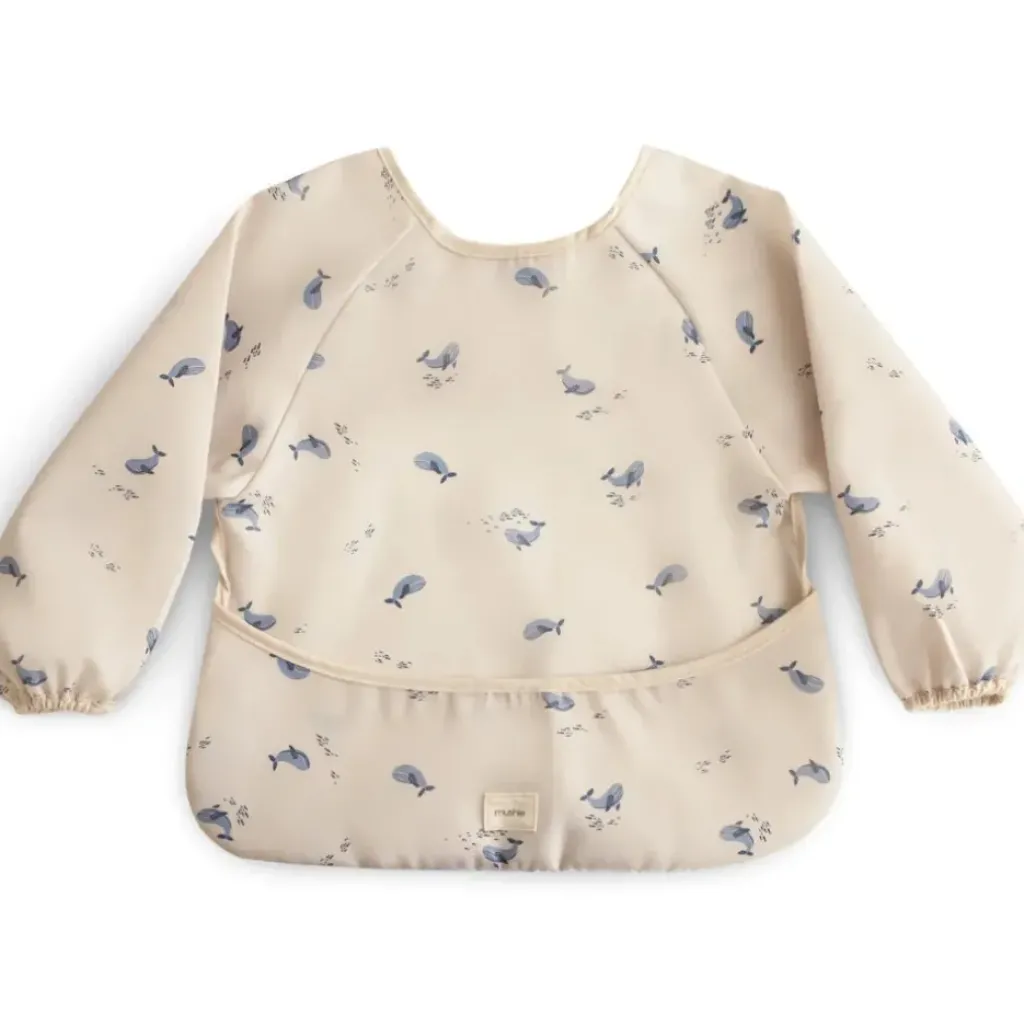 Le bavoir imperméable doté de manches longues est idéal pour protéger les vêtements au moment des repas. On craque pour son imprimé Baleines.