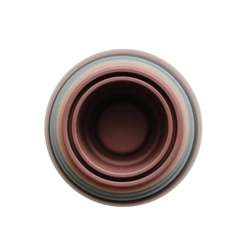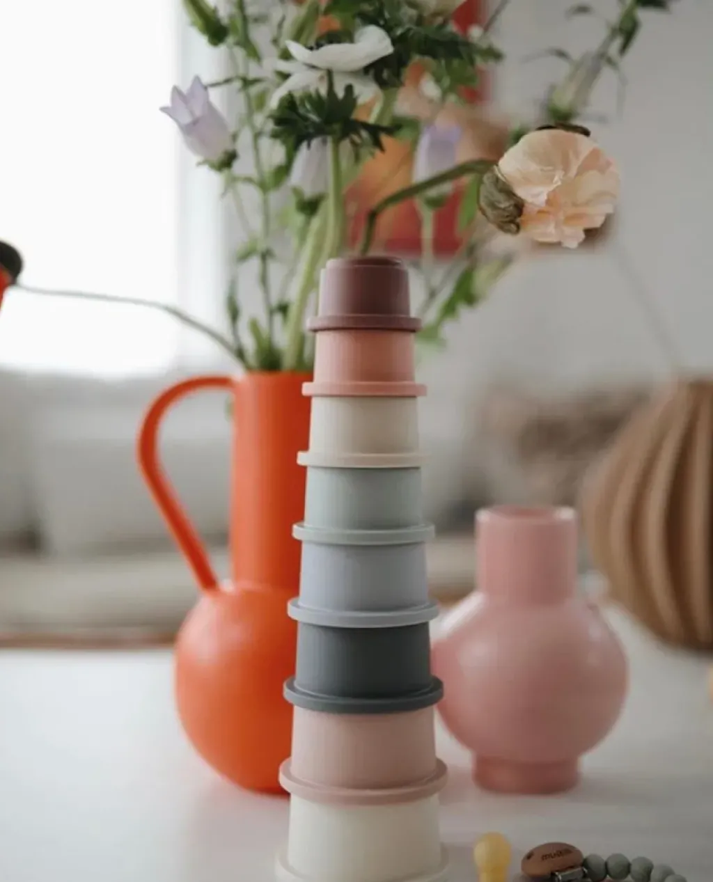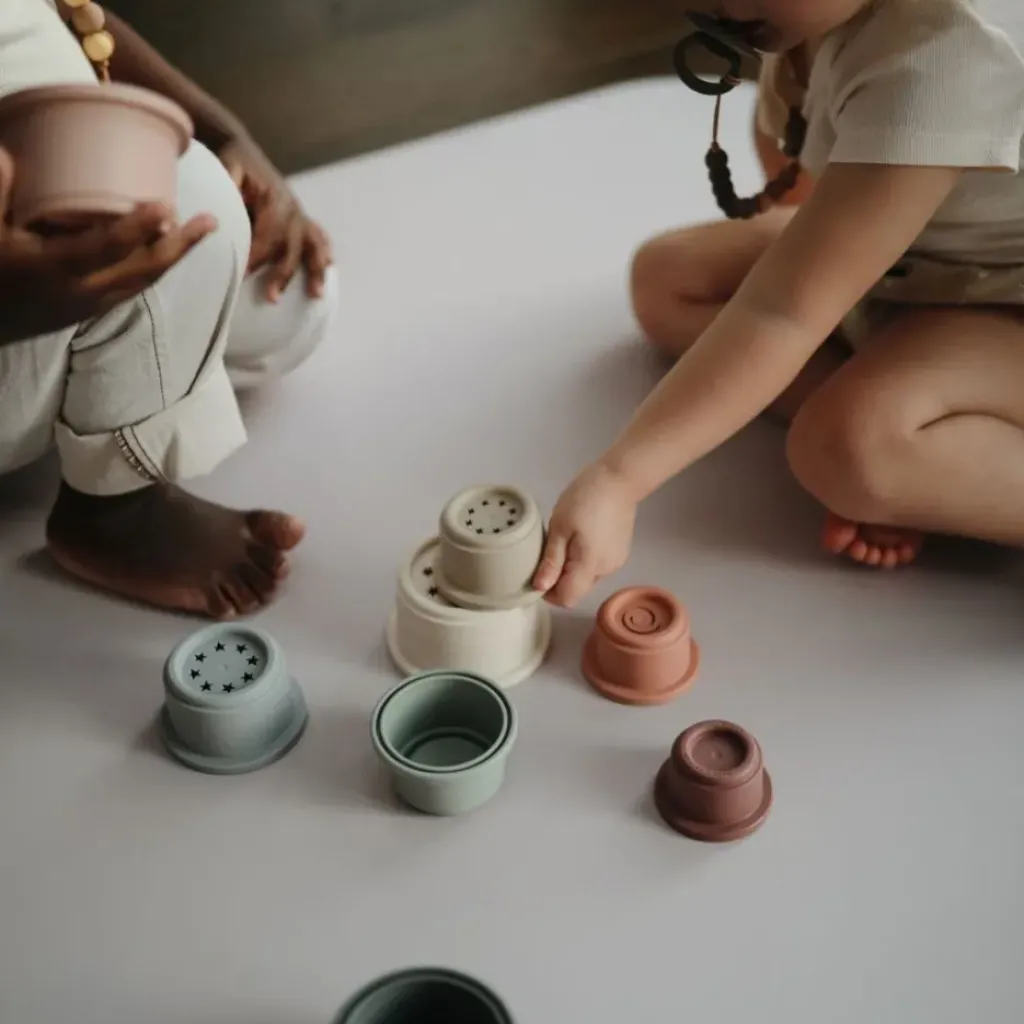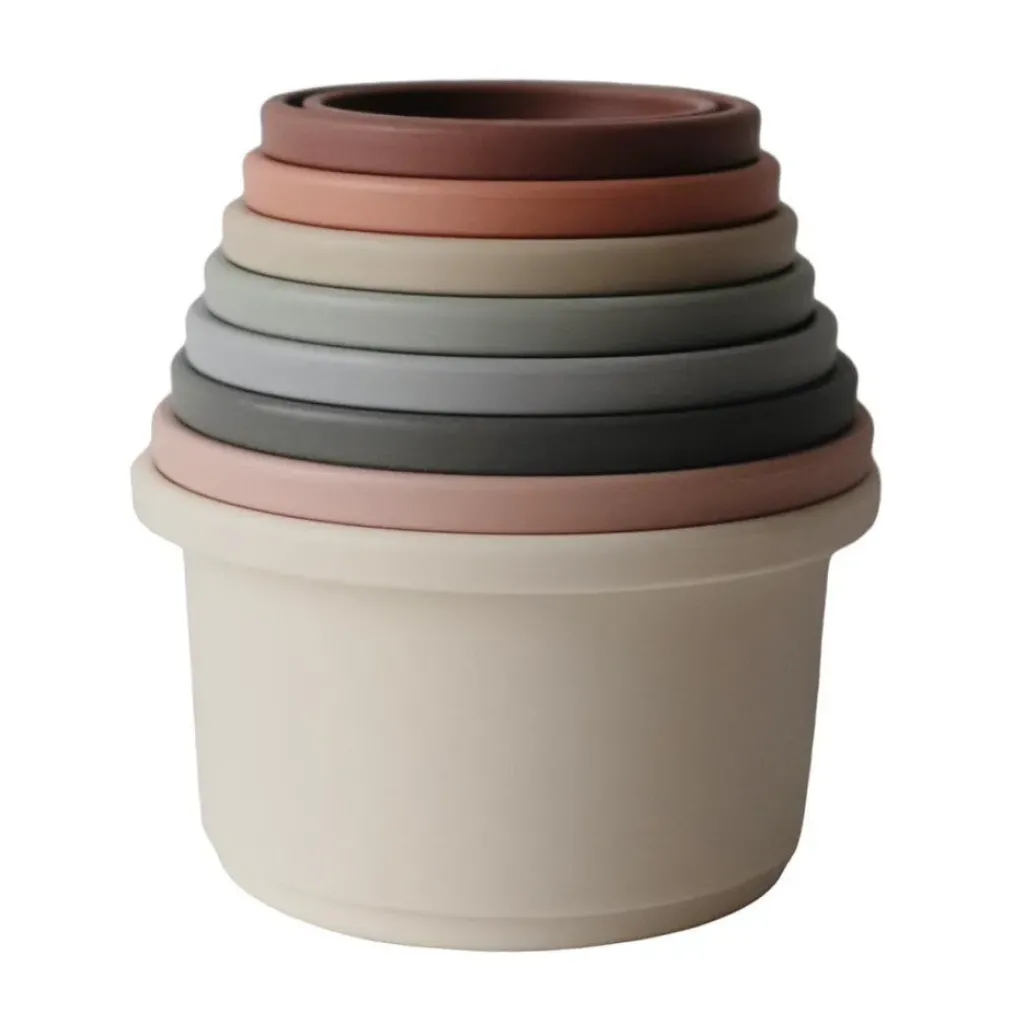 Une tour comprenant 8 gobelets empilables de la marque Mushie. Des couleurs neutres et des petits dessins sur le dessus de certains gobelets. Aide à améliorer la motricité fine. Les jouets empilables et les tours empilables aident à développer les compétences de coordination main-yeux corps et le cerveau à partir d’environ 6 mois.