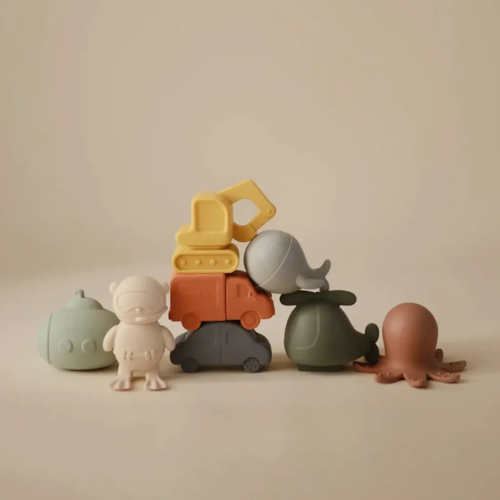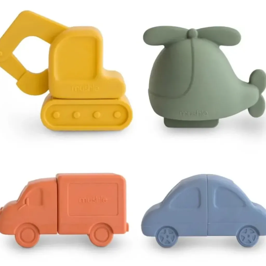 Faites du bain de bébé un moment de jeu avec l’ensemble de jouets pour le bain Sealife de Mushie ! Il comprend 4 figurines : voiture, hélicoptère, tractopelle, camion