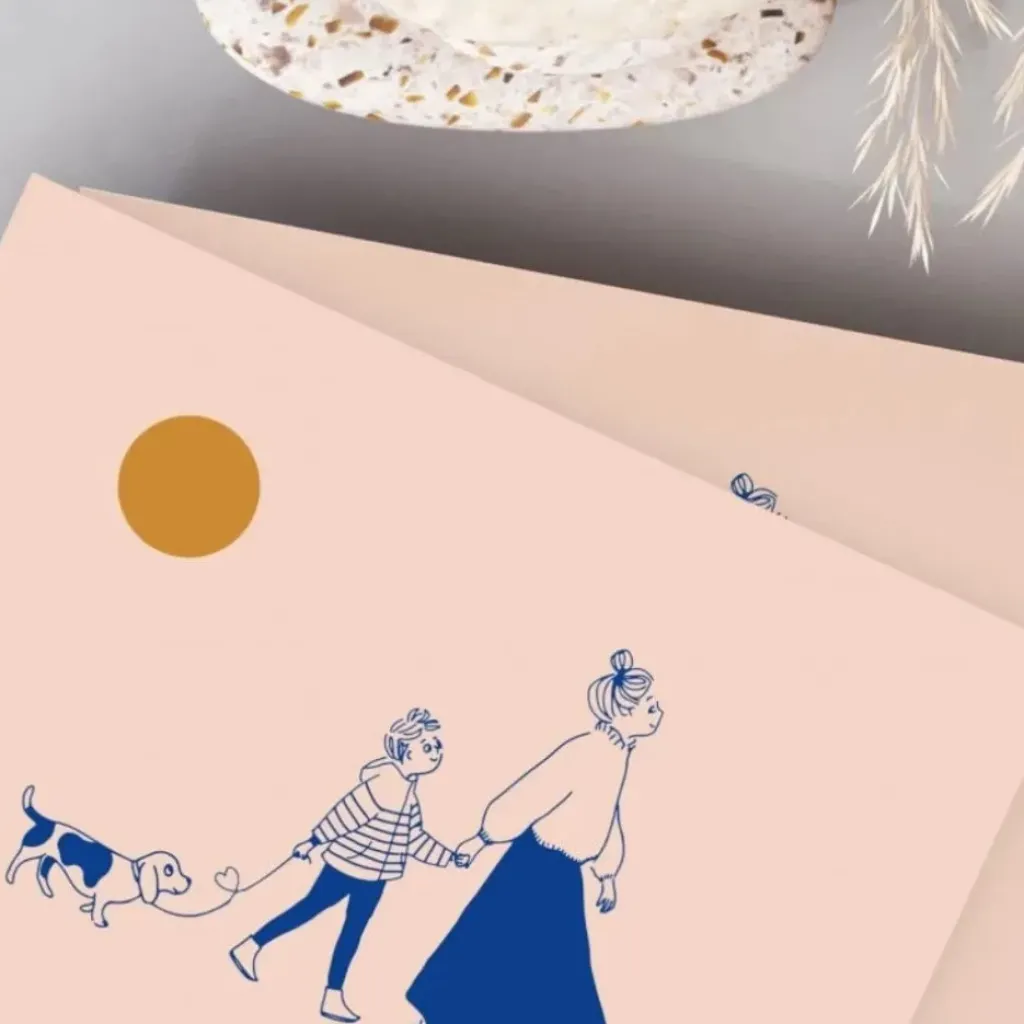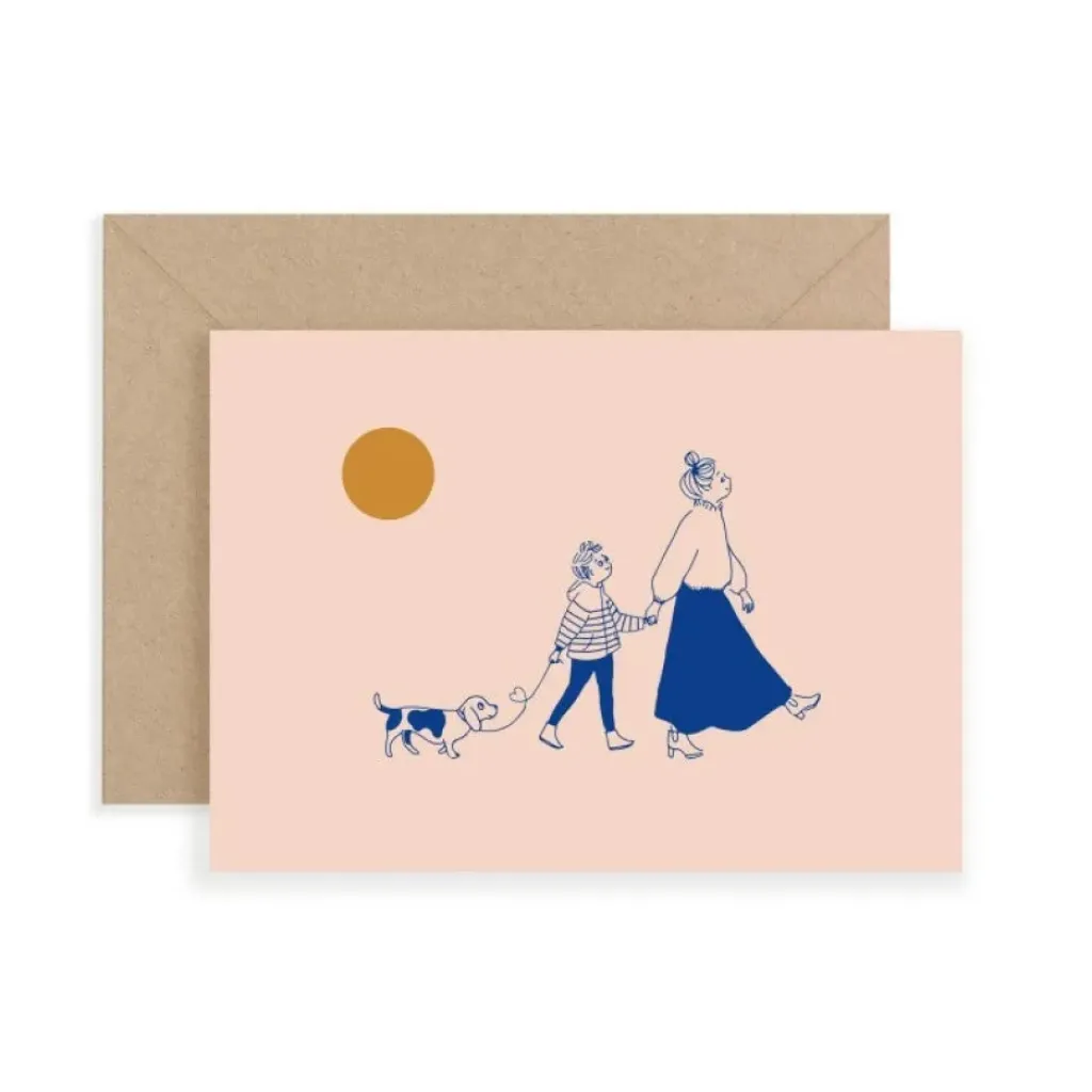Une maman, son enfant, et son chien, main dans la main, se promènent au clair de lune. Un joli petit détail sur la laisse. Grand sentiment de plénitude et de bonheur pour cette belle carte tricolore.