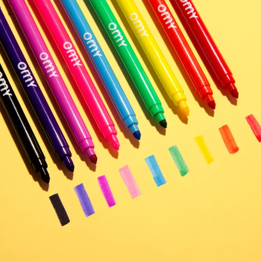 - 9 feutres double pointe : 1 fine, 1 large. Pratique, la boîte se transforme en pot à crayons à la maison !