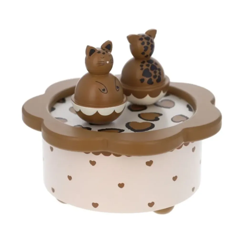 Adorable boîte musicale chatons . Posez la sur une commode dans la chambre de votre bébé et éveiller ses sens avec la musique et en voyant les petits chats s’animer. Un motif léopard et la chanson « une chanson douce » qui se fait entendre.