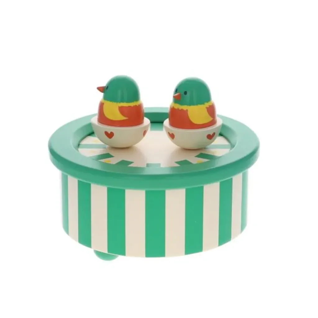 Une jolie petite boîte à musique aux motifs rayés verts et blancs ! Vous allez craquer et vous laisser transporter par la mélodie de cette belle boîte à musique et son imprimé rayé de la collection Les Inséparables. Faites tourner la petite molette en dessous de la boîte, placez les deux petites figurines aimantées représentants des oiseaux Inséparables et laissez bébé être bercé par la musique qui s’en dégage : « What a wonderful world ». Un magnifique objet de décoration à placer dans la chambre de votre bébé pour l’aider à s’endormir, le rassurer et calmer ses cauchemars et gros chagrins.