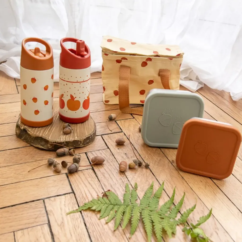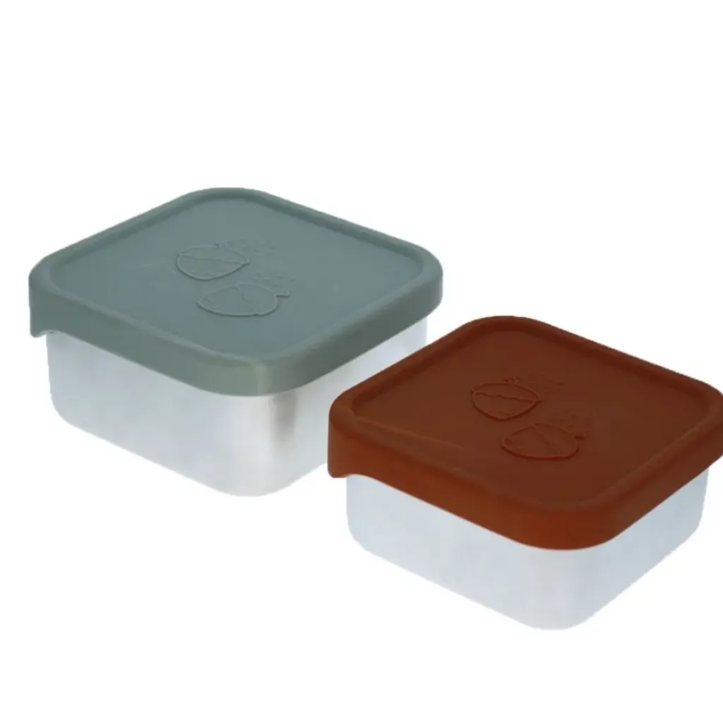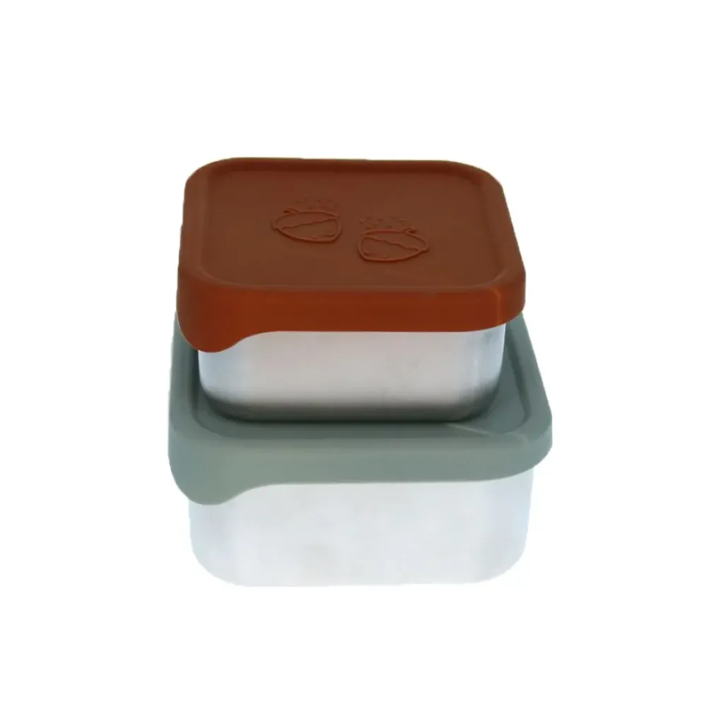 Un lot de 2 boîtes à goûter en métal et silicone pour le goûter de votre enfant.