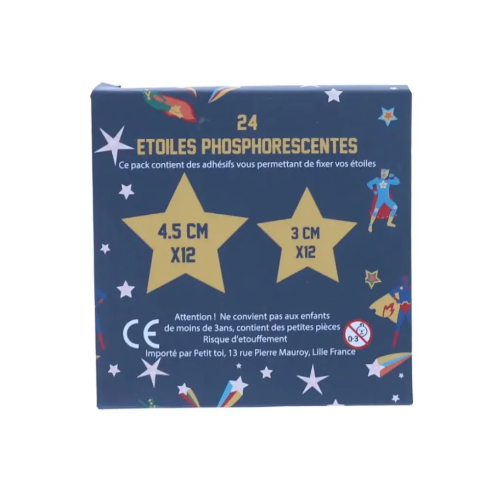 Laissez les étoiles illuminer les nuits de vos enfants avec ce lot de 24 étoiles phosphorescentes ! De deux tailles différentes : 12 étoiles de 3cm et 12 étoiles de 4,5cm, le rendu sera parfait pour éclairer la chambre des petits astronautes en herbe. Avec leur adhésif fournis dans la boite, elles se collent parfaitement sur les surfaces et ne risquent pas de tomber une fois bien collées.