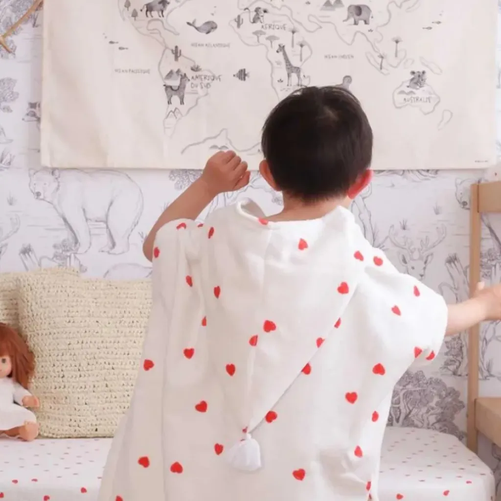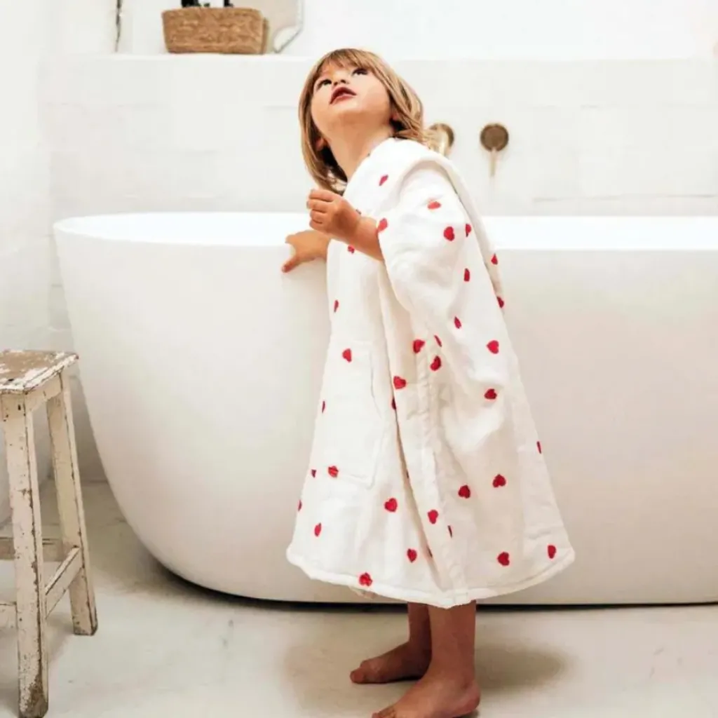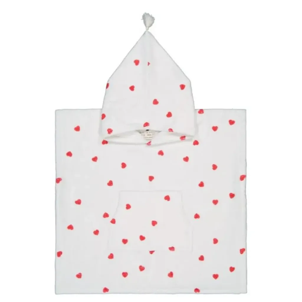 Poncho éponge en coton de Rose In April à rayures et au coloris blanc à cœurs rouges. A utiliser également pour les sorties à la plage ou à la piscine.