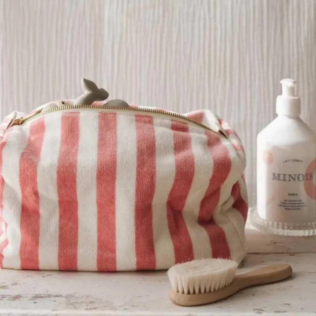 Trousse de toilette éponge rayé de Rose In April au coloris rose et blanc.