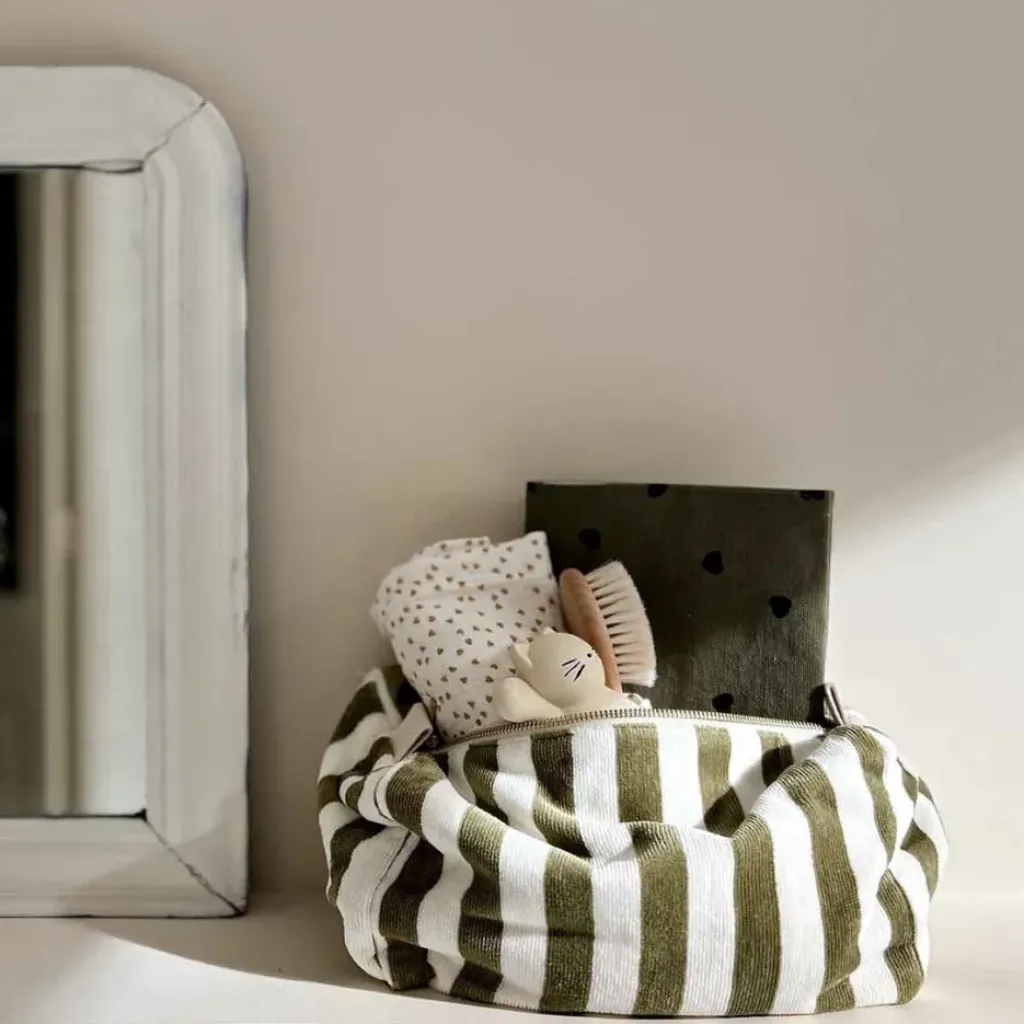 Trousse de toilette Rose in April, motif rayures kaki.Parfaite pour emporter le nécessaire de toilette, le temps d’un week-end, ou d’un petit voyage !