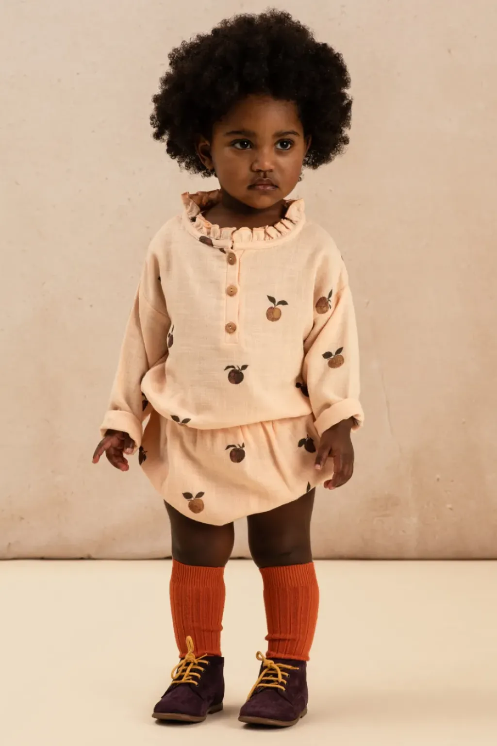 Blouse rose clair imprimée pommes manches longues en gaze de coton. On adore ses jolis détails au col et les jolis imprimés !