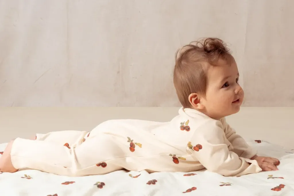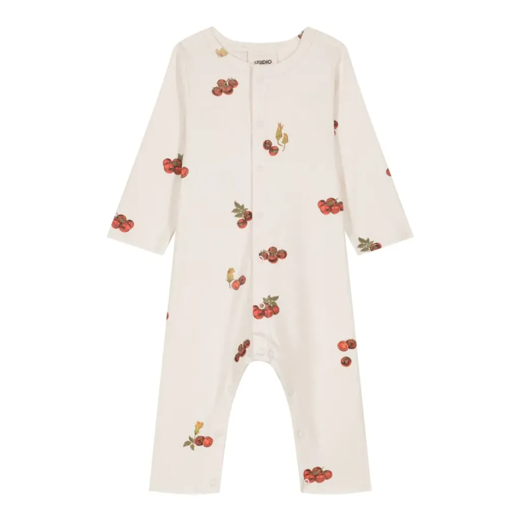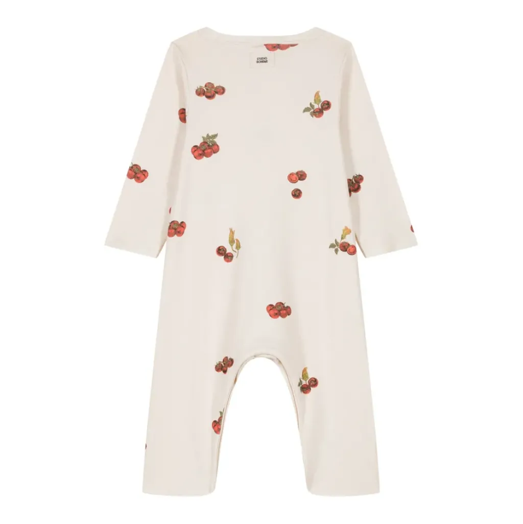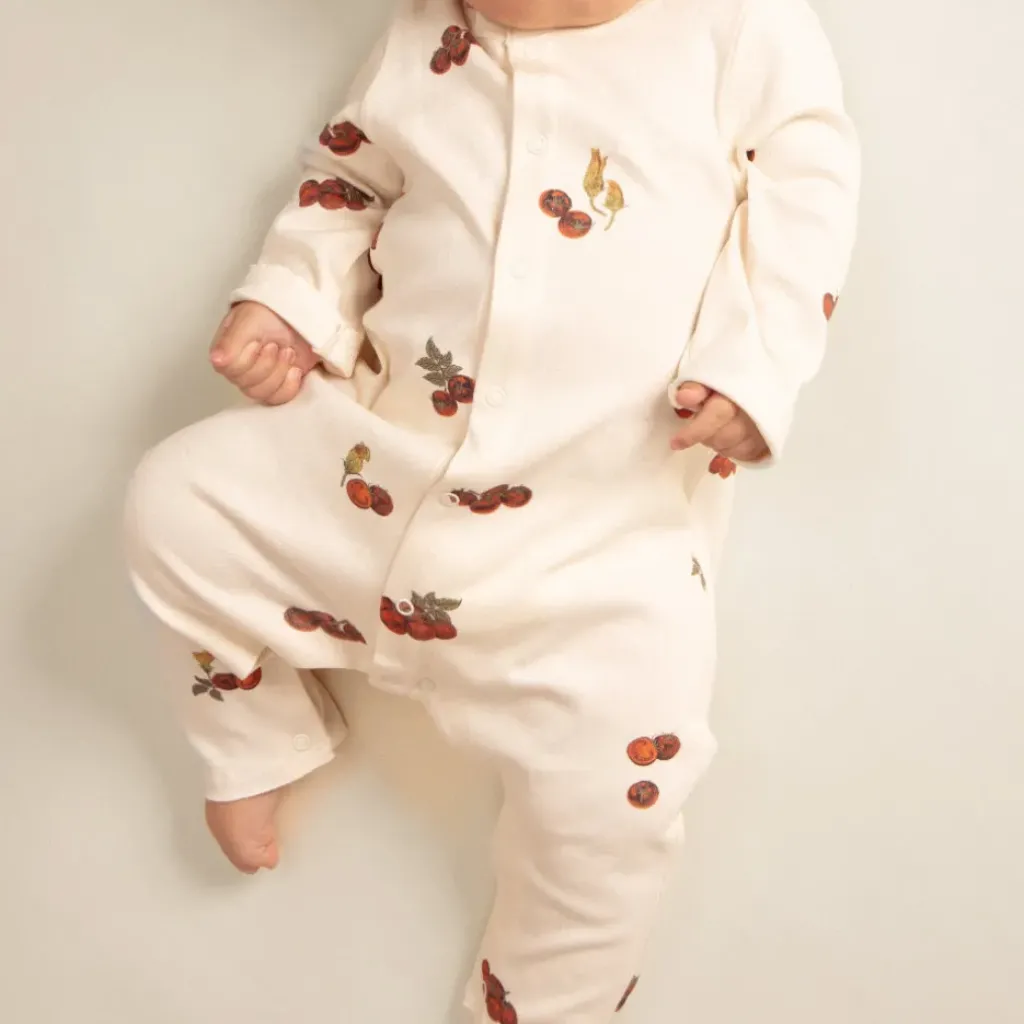 Combi mixte à motifs tomates, bien trop mimi ! À manches longues et en coton biologique, il sera tout doux sur la peau.