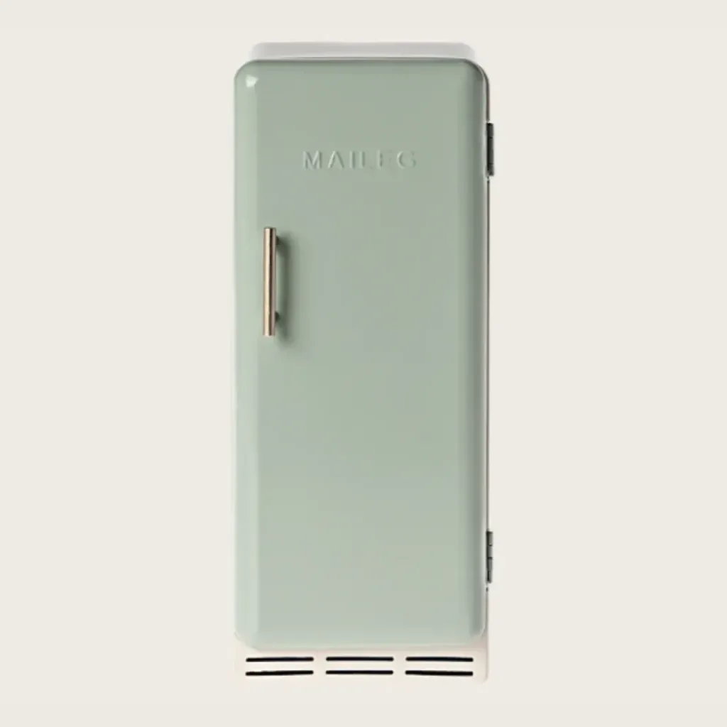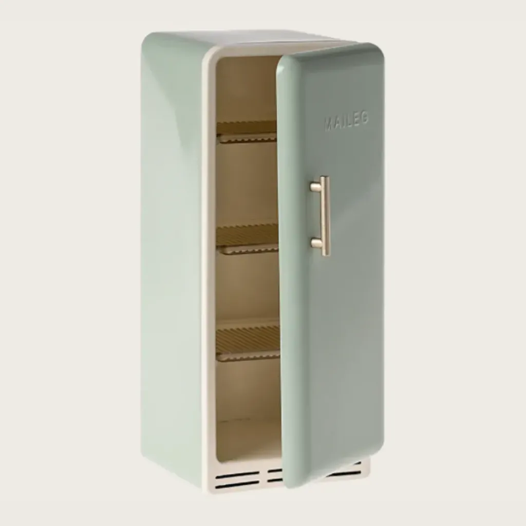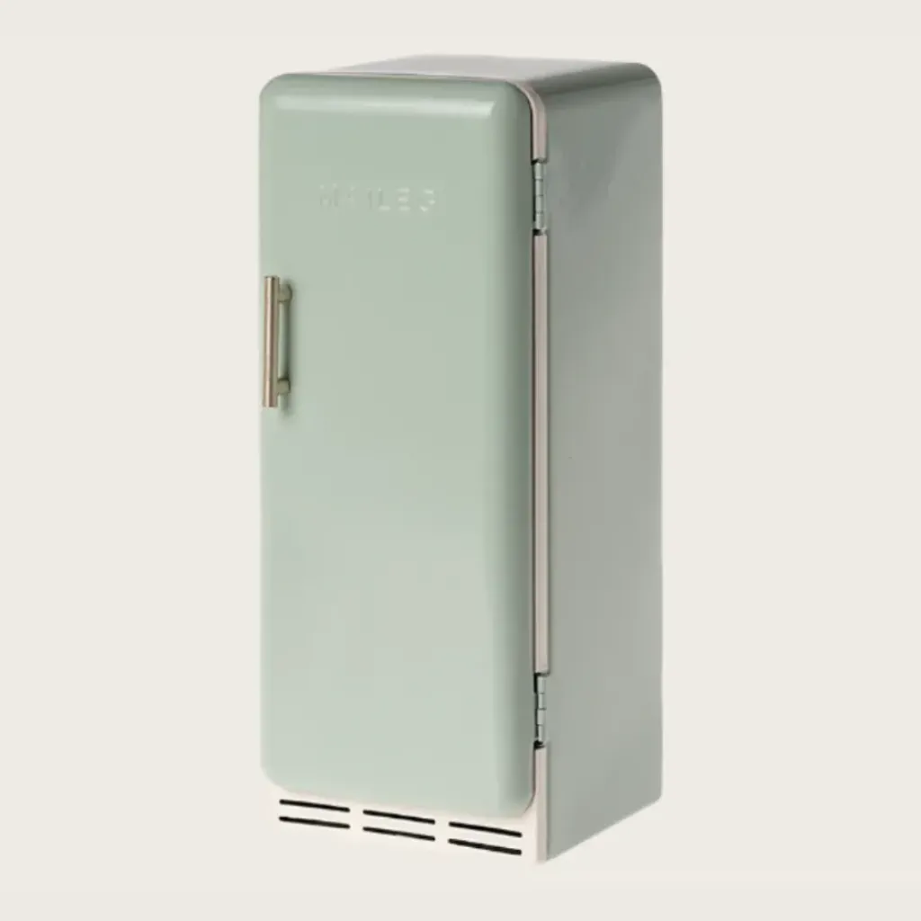 Un réfrigérateur vintage, en métal, qui s’intègre parfaitement au maison des souris. Il possède une fermeture magnétique et des étagères givrées à l’intérieur.