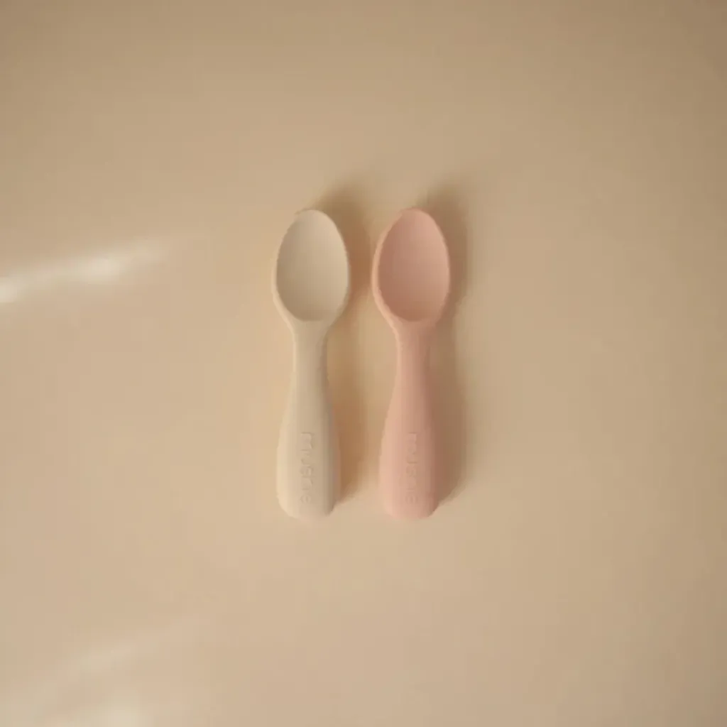 Deux cuillères en silicone alimentaire parfaites pour les touts petits ! L’embout en silicone souple protège les gencives sensibles et les dents naissantes de bébé.