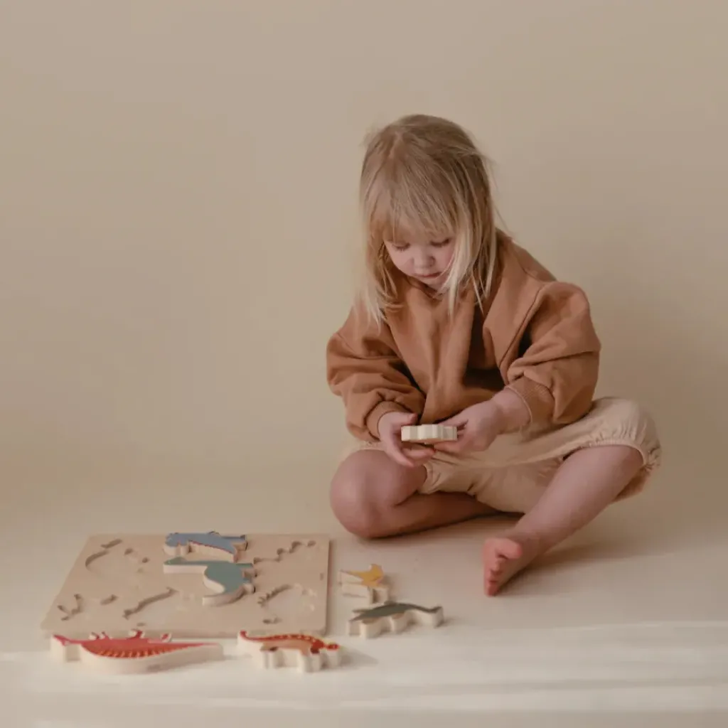 Faites découvrir aux enfants les merveilles de l’univers avec le puzzle dino en bois de Mushie.