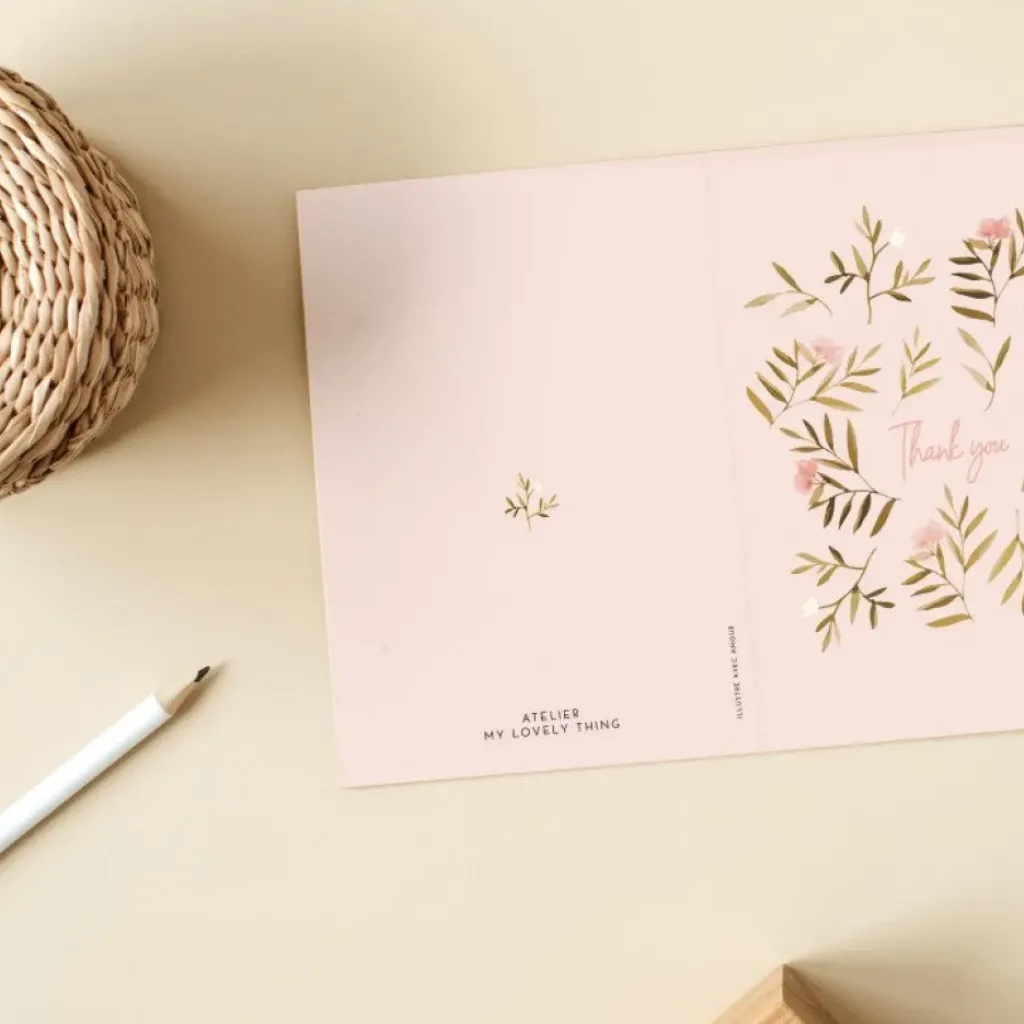 Une carte double de remerciement tout en poésie, avec de jolis fleurs et branchages aquarellés, couleurs d’automne, sur fond rose. Cette carte double est idéale pour remercier quelqu’un qui compte pour vous.