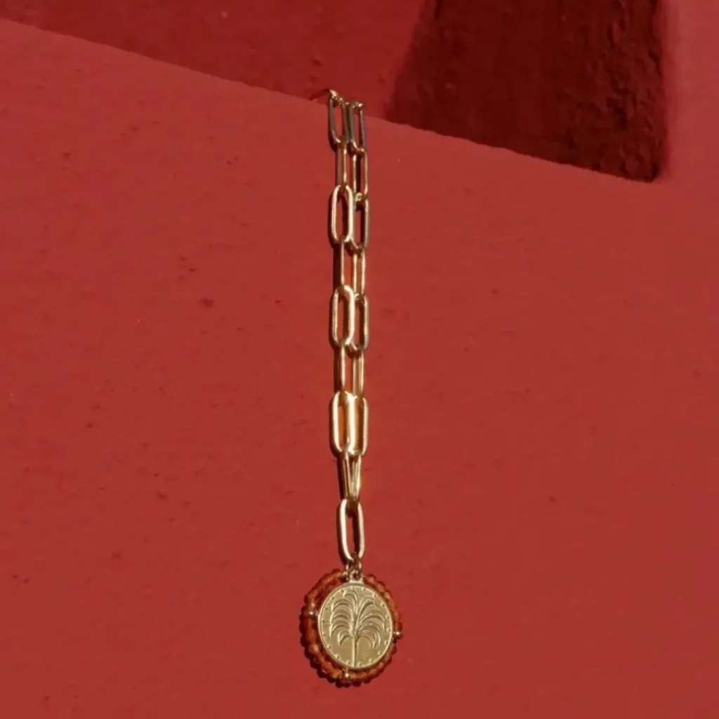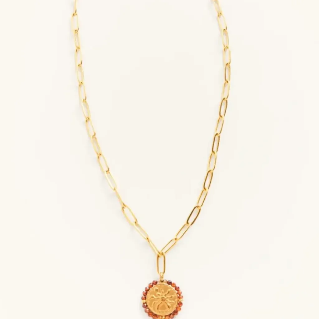 Quand le charme de la médaille Belamar et la modernité du collier chaine se rencontrent, ça donne la médaille Palma. Une chaîne maillon dorée et un médaillon orné de pierres semi-précieuses.