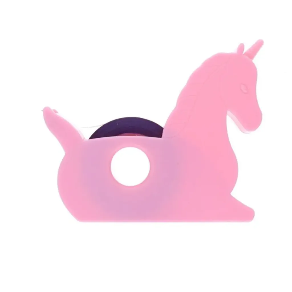 Un dévidoir de ruban adhésif rose bonbon en forme de licorne.
