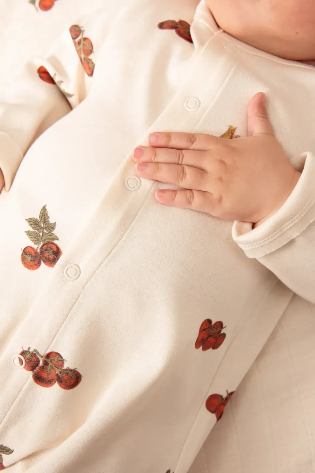 Combi mixte à motifs tomates, bien trop mimi ! À manches longues et en coton biologique, il sera tout doux sur la peau.